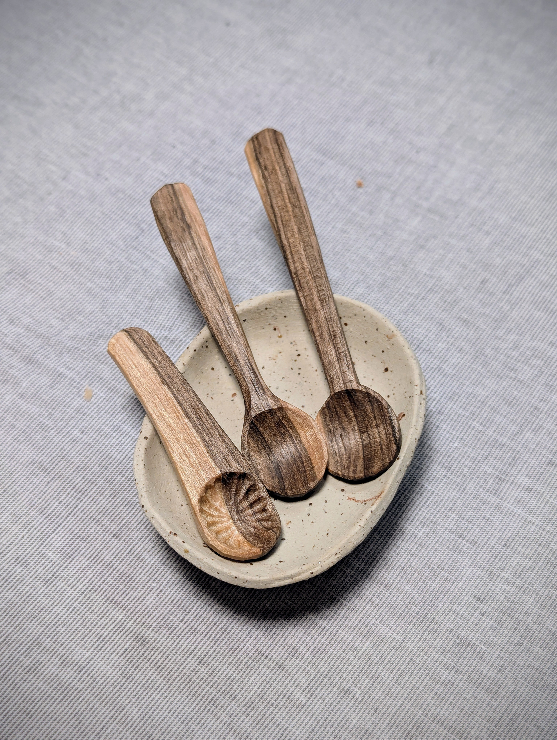 Besonders gerne fertige ich Löffel in allen Größen und Formen: Esslöffel, Servierlöffel, große Kochlöffel und kleine, feine Teelöffelchen. Manchmal entstehen auch Holzdosen, Klammern, kleine Schalen und andere schöne Dinge. Je nachdem, welches Holz ich gerade zur Verfügung habe. Dabei nutze ich weder elektrische Werkzeuge noch Schleifpapier. Die schöne natürliche Oberfläche entsteht allein mit dem scharfen Schnitzmesser.